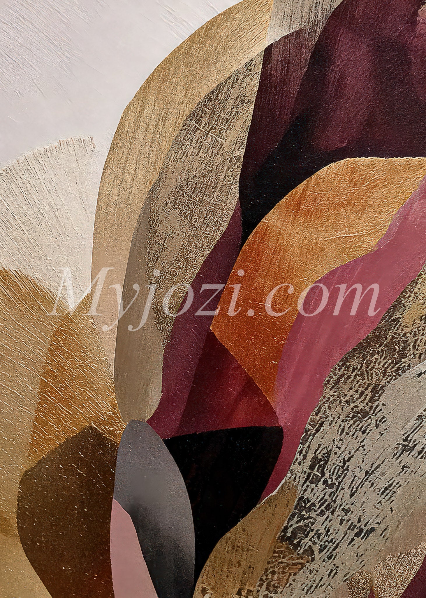 ”Toner av Stillhet” förenar mjuka sandfärger med djupare skuggor i rött och lila. Resultatet är en affisch som sprider lugn och värme och som blir en självklar del av en harmonisk inredning.